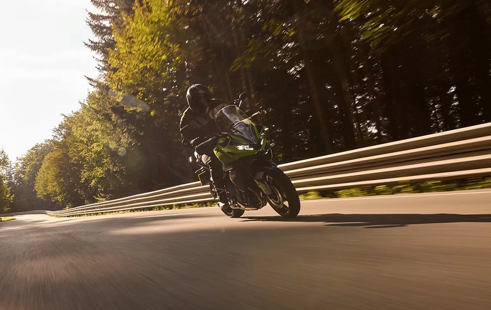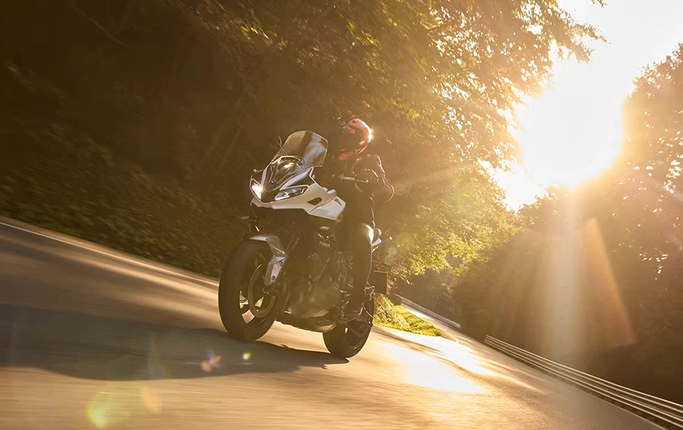 A Tiger Sport 660 proporciona uma manobrabilidade que inspira confiança, graças aos 207 kg de peso líquido e aos garfos invertidos Showa de 41 mm. Em combinação com os pneus Michelin Road 5, que dão maior aderência em todas as condições, e os freios a disco duplos Nissin de 310 mm, ela foi criada para ser ágil, seja para percorrer as ruas estreitas da cidade ou para fazer curvas rápidas e fluidas na estrada. A suspensão traseira monoshock Showa com ajuste de pré-carga garante conforto e estabilidade, rodando sozinho ou com garupa.