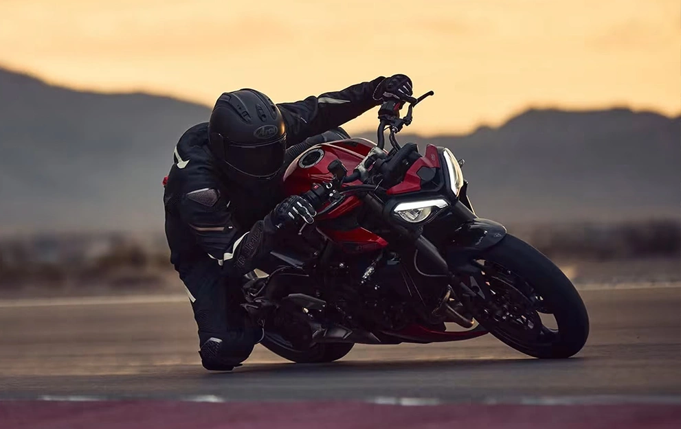 ABS otimizado para curvas, apoiado por uma IMU com configurações sob medida integradas em cada um dos cinco modos de pilotagem da Street Triple RS, assegurando desempenho de frenagem ideal para cada ângulo de inclinação.